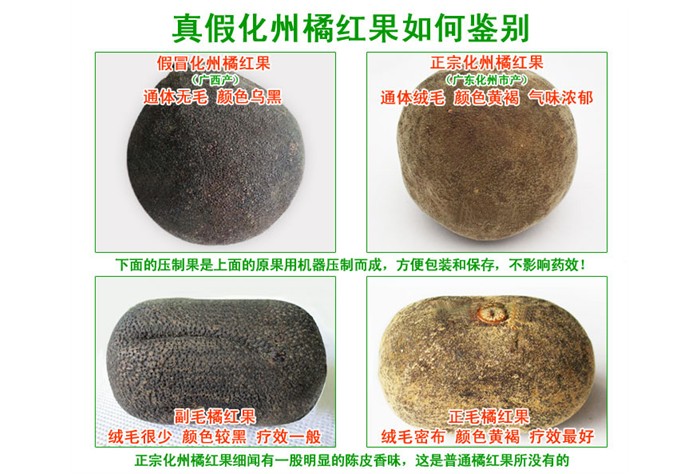1、绒毛:正宗化州橘红表皮上遍布细小绒毛,这是主要特征之一,包括制好的橘红果,大家买到手里的就是带有绒毛的。其它地方的橘或者柚是没有绒毛的,新鲜的时候他们的表皮非常光滑,干了之后也没有绒毛。
