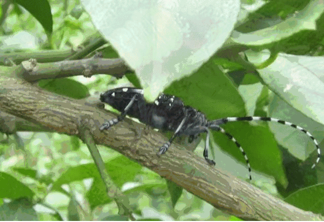 (2)人工防治:A掌握天牛成虫羽化活动期,利用成虫飞翔能力不强,有假死性,可大力进行人工捕杀,特别是在晴天中午(星天牛)的枝梢或傍晚(褐天牛)的枝干基部上常可见天牛成虫,应注意捕杀。B天牛产卵多在树干基部,初孵幼虫多在树干皮层部为害,当树皮上出现半月形的产卵伤痕时,当用锤轻轻敲击受害部,杀歼树皮下的卵或幼虫。C经常检查树体及地面,发现木屑和虫粪,再找出最下面的蛀孔后,用摩托车的离合线或刹车线或不锈钢焊线沿蛀道向下刺杀幼虫,拔出后看到线头上有白色的粘液表明已将幼虫捅死。